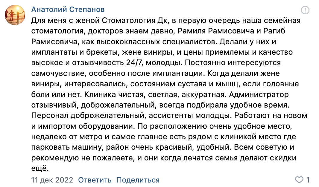 Десна кровли, искала стоматологию рядом с домом, увидела что открылась новая стоматология Дк, филиал Санкт-Петербурга, посмотрела отзывы, были очень хорошие.Приняла меня доктор Диана, сделала чистку зубов, безболезненно и аккуратно, дала рекомендации и назначения чтобы дома делала. Прошла уже неделя как была у доктора и десна перестали кровить, спасибо огромное.Стоматология чистая, приятная, персонал доброжелательный.Рекомендую
